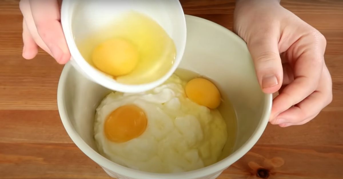 1. Do wysokiej miski przelej cały jogurt. Następnie wbij do niego jajka i całość ubijaj do momentu aż połączą się ze sobą te dwa składniki. Przesiej przez sito do miski mąkę kukurydzianą.