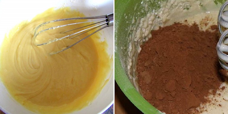 1. Do miski, wlej 100 g roztopionego masła, cukier, jedno opakowanie cukru waniliowego, 1 łyżkę kakao i dobrze wymieszaj składniki.