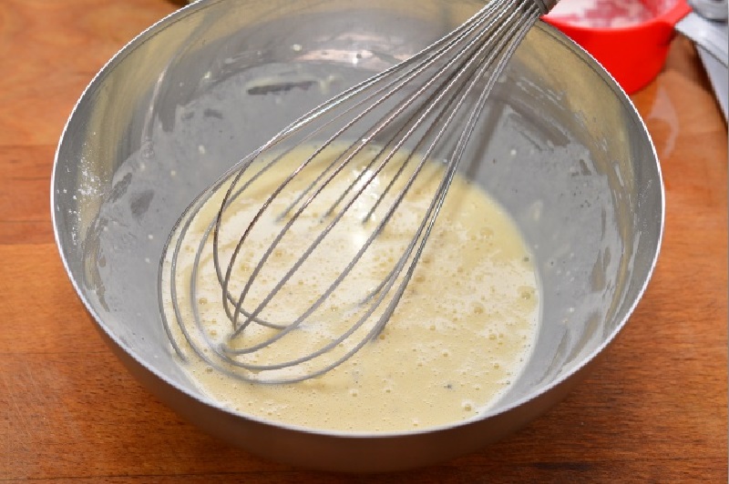 2. Następnie przygotuj ciasto. Ubij mąkę, jajko i piwo trzepaczką. Posól i popieprz do smaku. Dzięki piwu uzyskuje się złotą i chrupiącą skórkę.