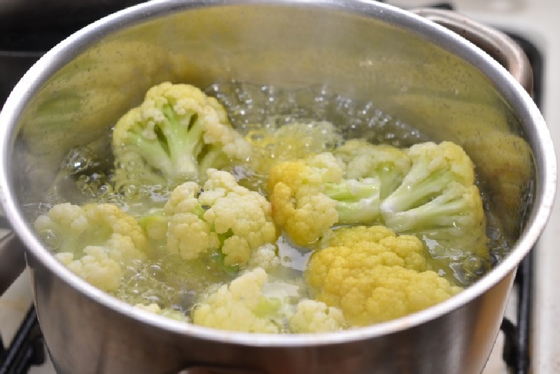 4. Zagotuj wodę, dodaj sól i wrzuć do niej różyczki kalafiora. Gotuj przez 5-7 minut. Bardzo ważne jest to, aby się nie rozgotował.