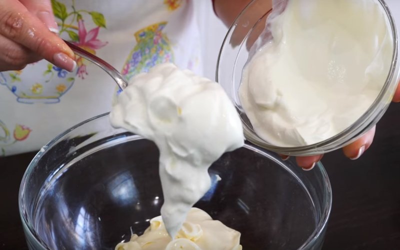 5. Teraz, wymieszaj majonez ze śmietaną, dodaj proszek do pieczenia, sól i jajka. Wymieszaj dokładnie na jednolitą, gładką masę. Zamiast kwaśnej śmietany i majonezu możesz użyć 100 ml kefiru.
