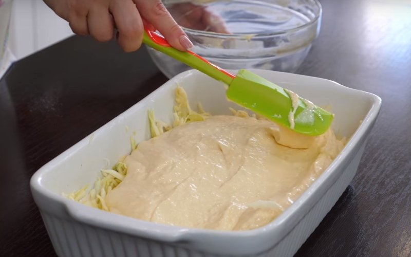 6.Dodaj następnie mąkę i dokładnie wymieszaj. Tak przygotowanym ciastem zalej kapustę.