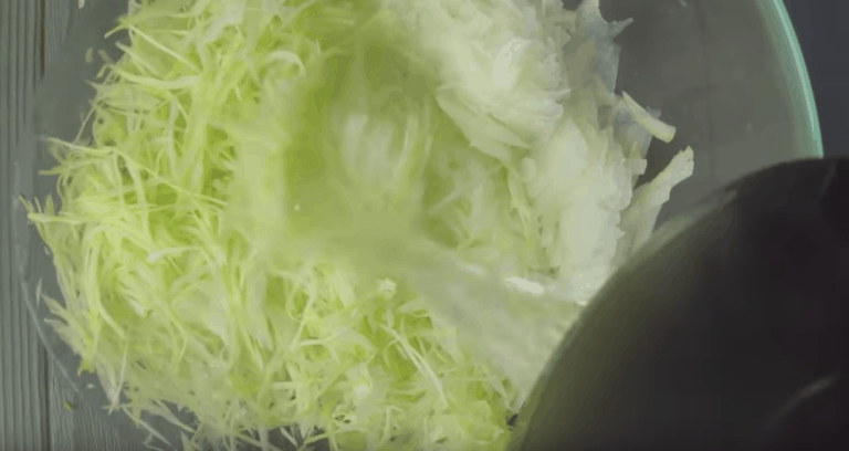 1. Kapustę i cebulę zetrzyj na tarce o drobnych oczkach. Jeśli chcesz to posiekaj nożem , ale kapusta musi być bardzo drobno posiekana. Włóż do głębokiej miski posiekane warzywa. Zalej wrzątkiem i odstaw na około 2 minuty.