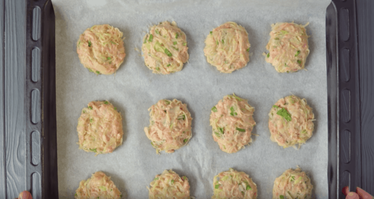 4. Z uzyskanej masy formuj małe kotleciki. Układaj je na papierze do pieczenia. Piekarnik nagrzej do 200 stopni. Uformowane kotleciki włóż do piekarnika na około 30 minut. Poczekaj do momentu zarumienienia.