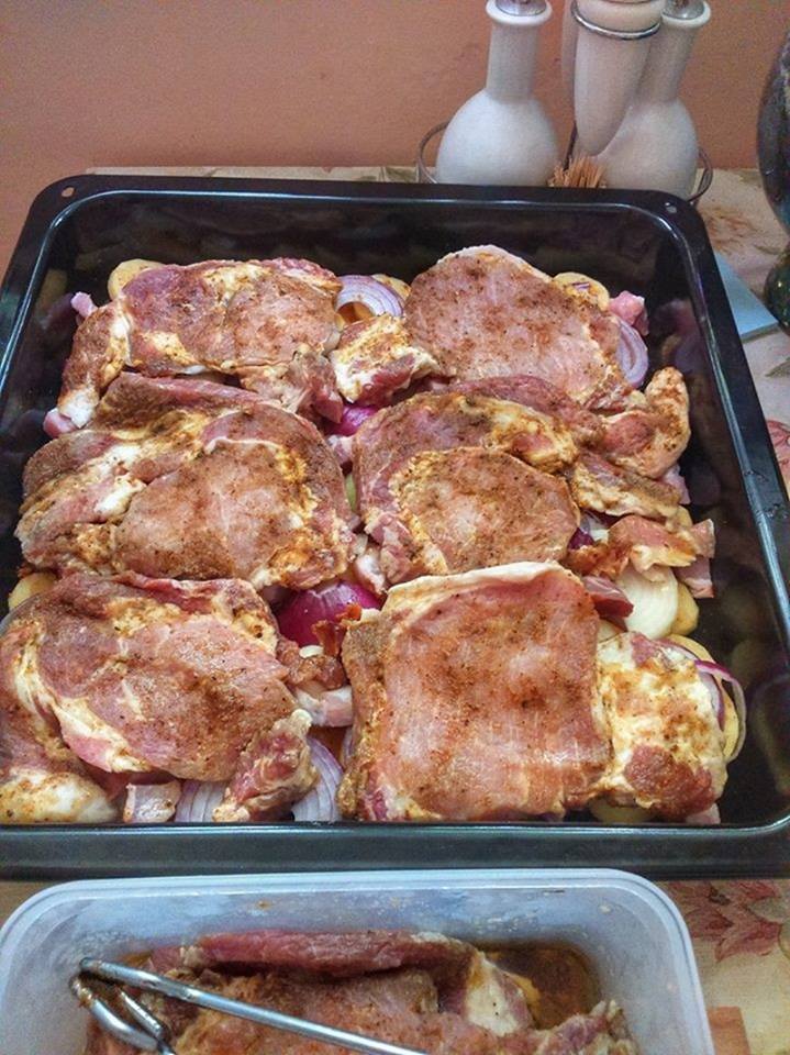 Na to wszystko kładziemy zamarynowaną już karkówkę. Blachę należy przykryć folią i przez godzinę piec w nagrzanym do 200 stopni piekarniku.