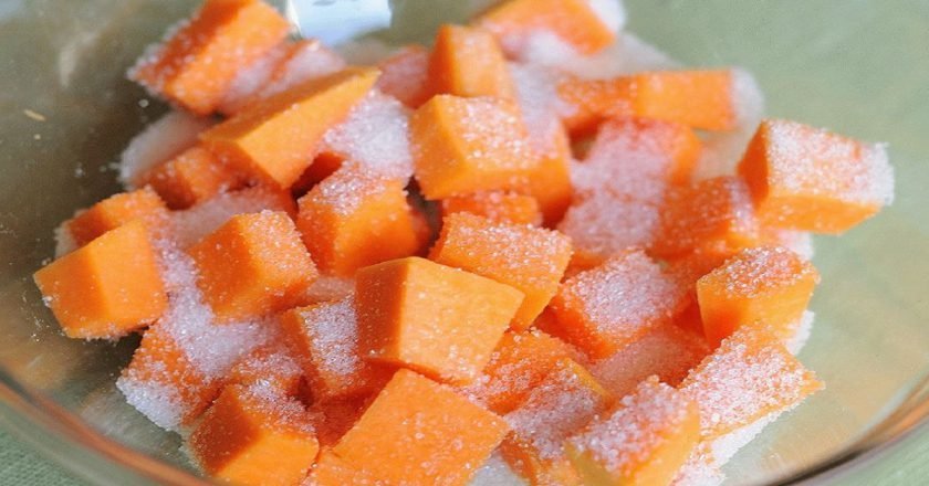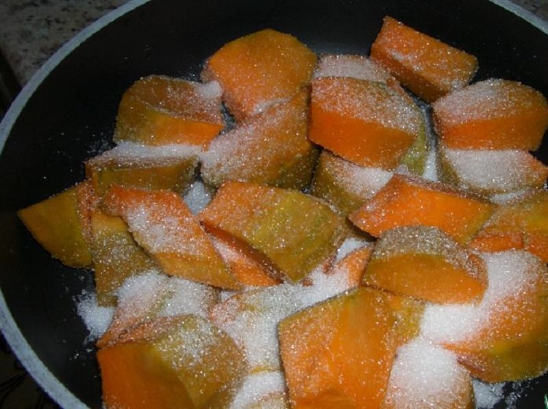 2. Podziel dynię na 3 części i w wygodnej misce, układaj warstwami najpierw dynię, posyp ją cukrem i skrop kilkoma kroplami cytryny, a następnie w tej samej kolejności pozostałe dwie warstwy.