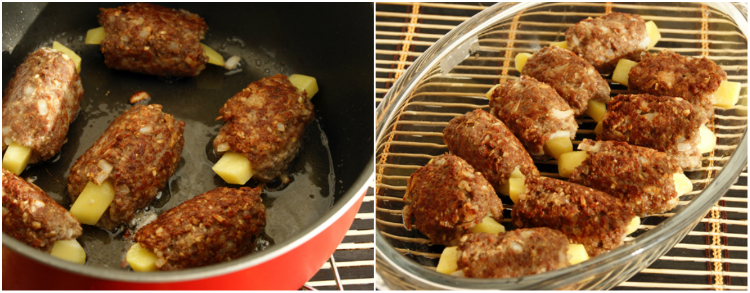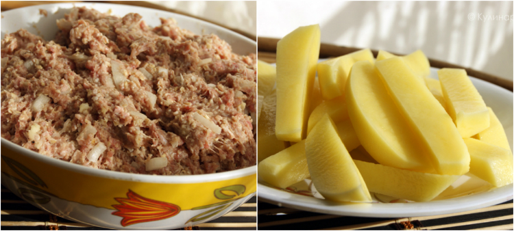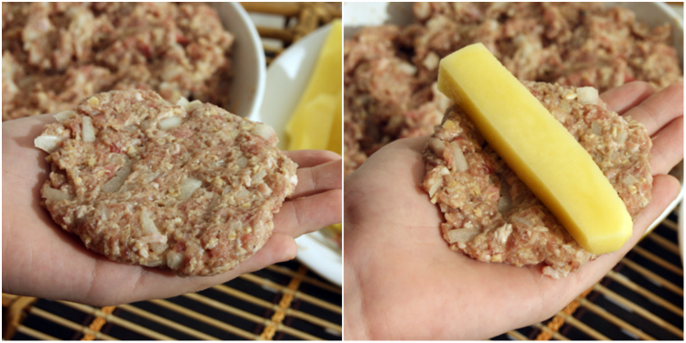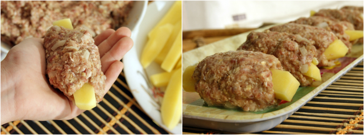 2. Jeden słupek ziemniaka, zawiń w porcji mięsa mielonego i uformuj zgrabne kotleciki.