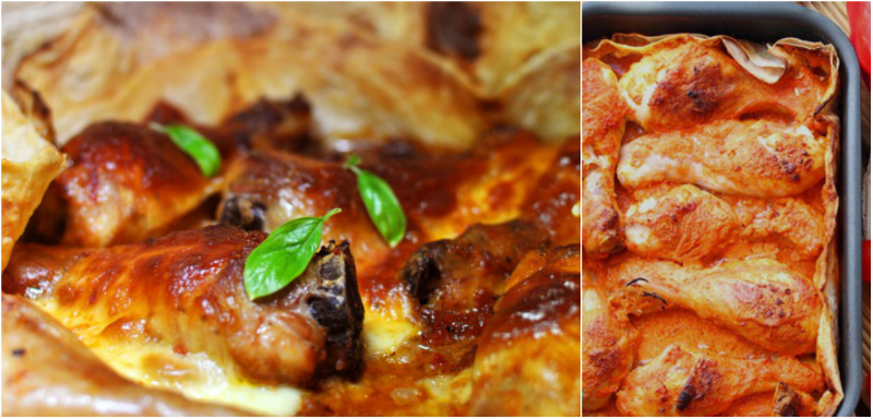 Każde podudzie kurczaka osobno, owiń w placek tortilli i ułóż ciasno na blaszce, a na koniec zalej całość marynatą. Smacznego!