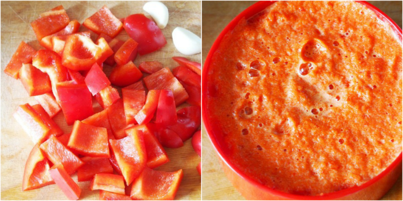 1. Umytą i oczyszczoną z pestek paprykę, pokrój na mniejsze kawałki, a następnie zblenduj wraz z obranym czosnkiem. Przełóż masę do głębokiej miski.