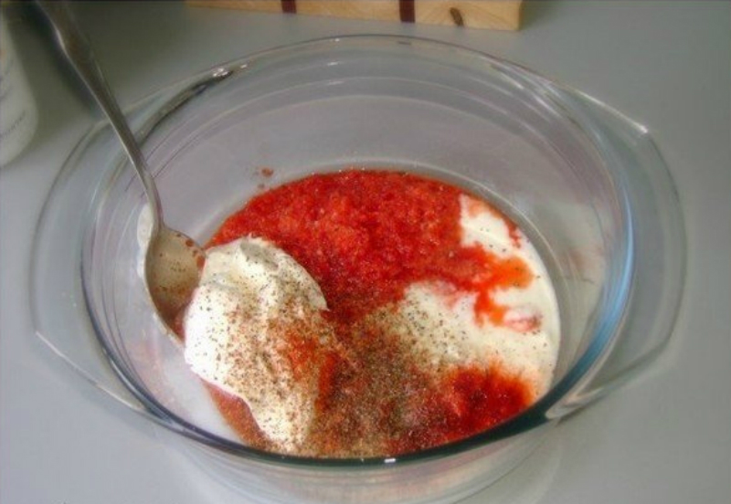 2. Teraz, dodaj jogurt naturalny, dopraw marynatę papryką chilli, czarnym pieprzem, gałką muszkatołową oraz solą i wymieszaj dokładnie.