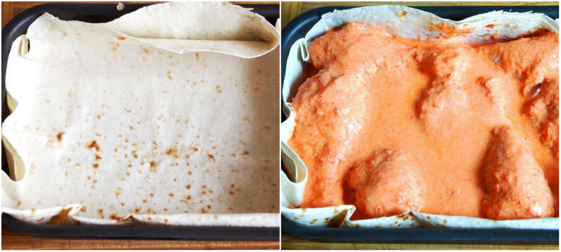 4. Blaszkę do pieczenia, wysmaruj kawałkiem masła i wyłóż czterema plackami tortilli. Placki tortilli z wierzchu wysmaruj pozostałym masłem. Teraz wyłóż na nie kurczaka i zalej równomiernie marynatą.
