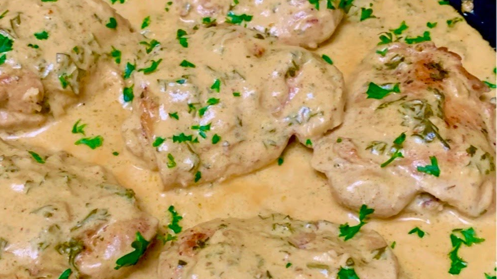 3.Uzywając tej samej patelni rozpuść masło , po czym wrzuć pokrojoną cebulę oraz przeciśnięty przez praskę czosnek. Gdy cebula się zarumieni, dodaj wcześnie przygotowaną mieszankę ze śmietany. Drobno posiekaj zioła, następnie przełóż je na patelnię. Cały czas mieszając, stopniowo dodawaj parmezan. Do przygotowanego sosu włóż podsmażone kawałki mięsa, następnie przykryj pokrywka i pozostaw tak na 20 minut, aby gotowało się na małym ogniu.