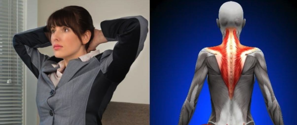 Rozłóż ręce na boki, następnie powoli ku górze kładź je na karku. Lewą ręką złap łokieć, a prawą powoli opuszczaj. Takie ćwiczenie powinny wykonywać osoby , które bardzo długo siedzą , podczas tych ćwiczeń rozciągają się mięśnie przy łopatkach, które przez długie siedzenie robią się sztywne.