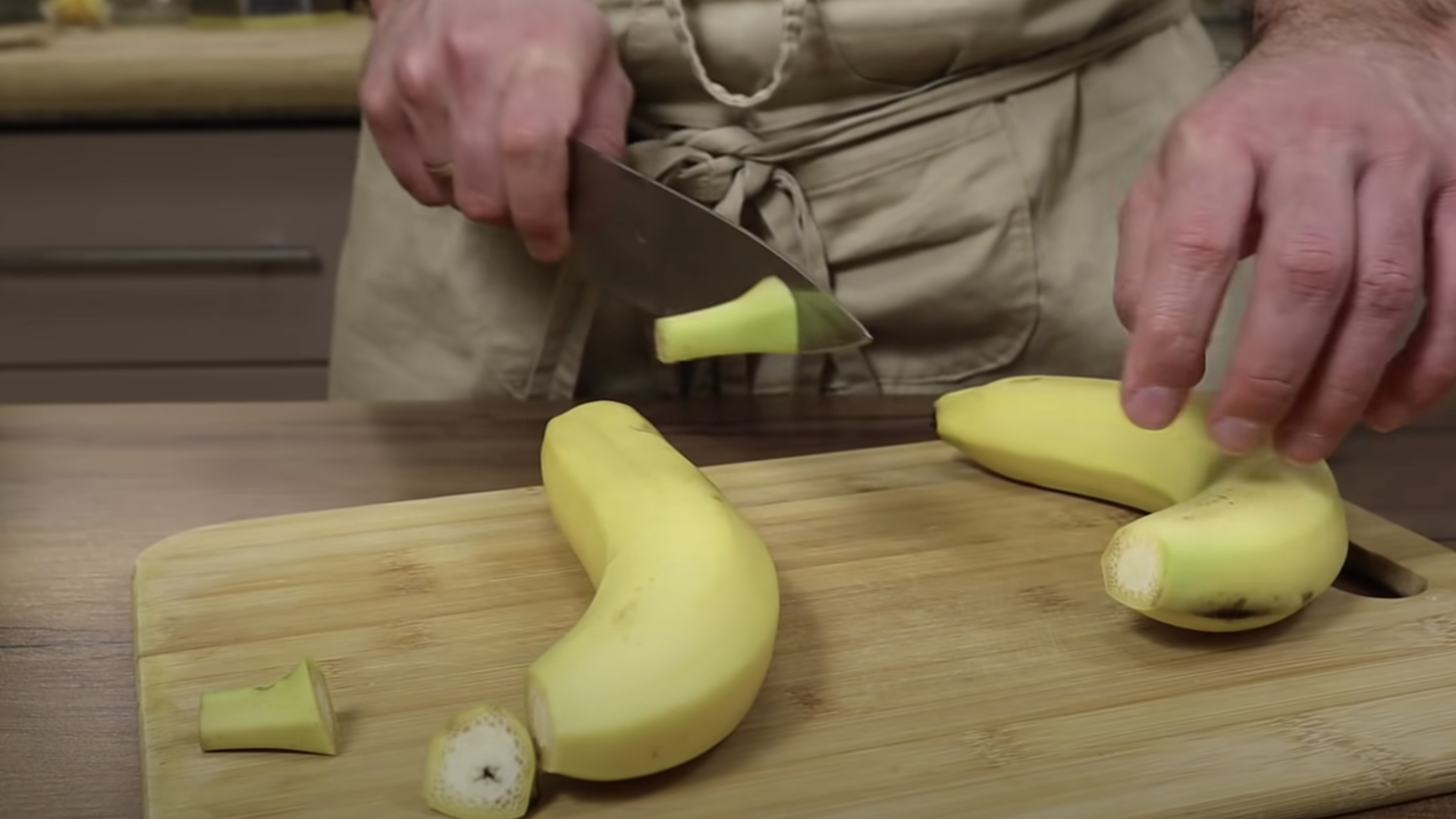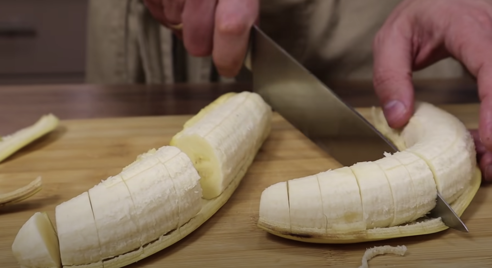 2.Banana obierz ze skórki, następnie w płaskie kawałki go pokrój.