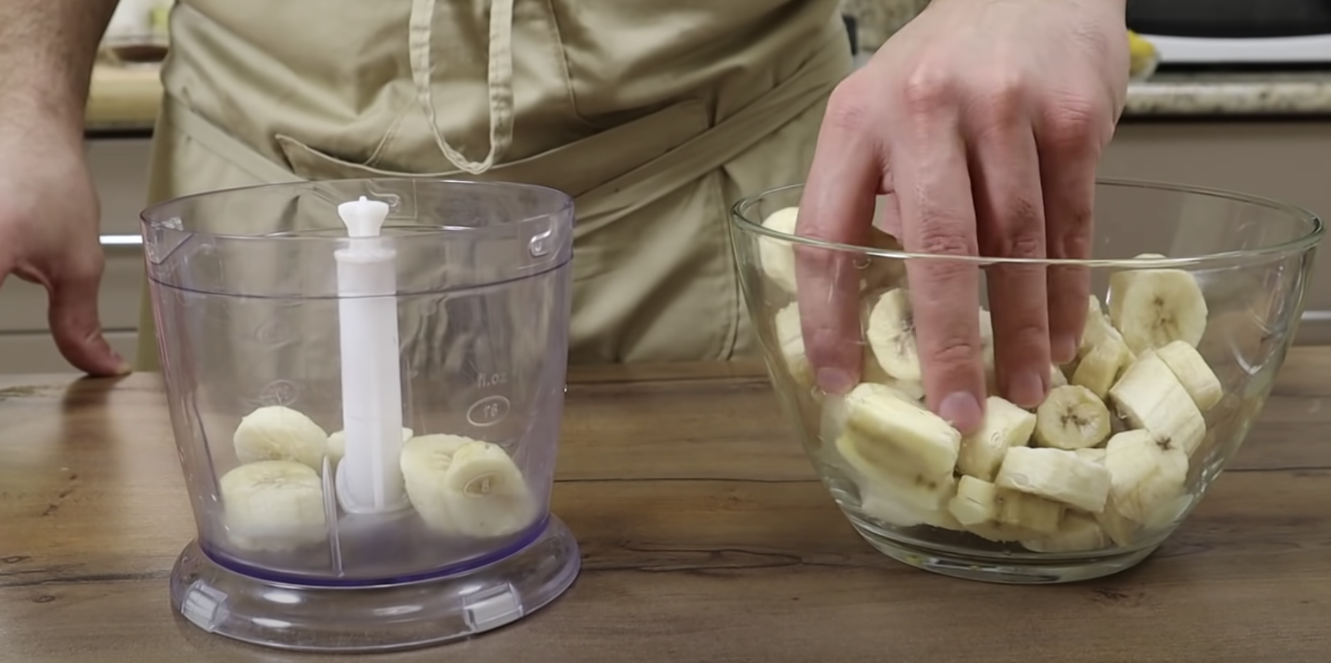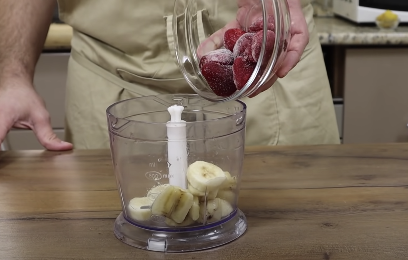 3.Do zamrażalnika włóż miskę, a w niej umieść banana. Później do blendera włóż.