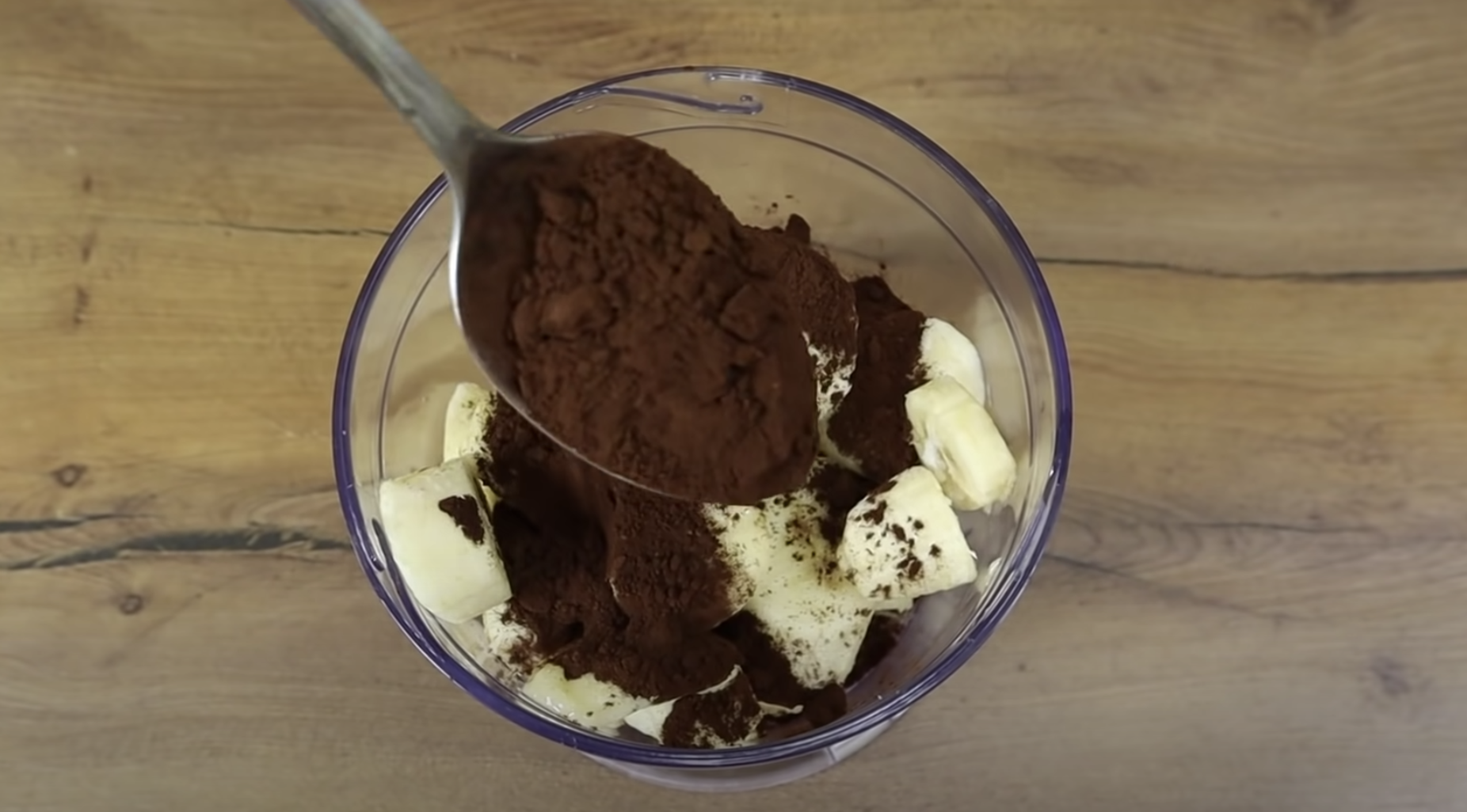 4.Dwie łyżki kakao dodaj do bananów, całość dokładnie wymieszaj.