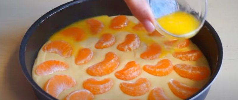 2. Gotowe ciasto, przełóż do formy wysmarowanej masłem i wygładź. Na wierzchu, poukładaj cząstki mandarynek, posyp 2 łyżkami cukru i polej roztopionym masłem.