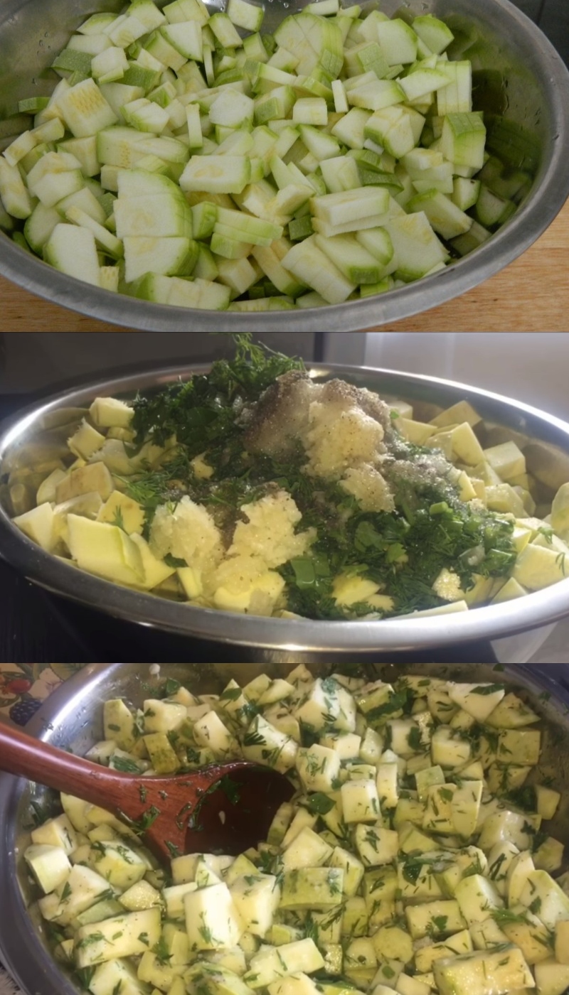 1. Do głębokiej miski włóż umytą i pokrojoną w drobną kostkę cukinię. Dodaj, przeciśnięty przez praskę czosnek, sól, pieprz, cukier i olej.