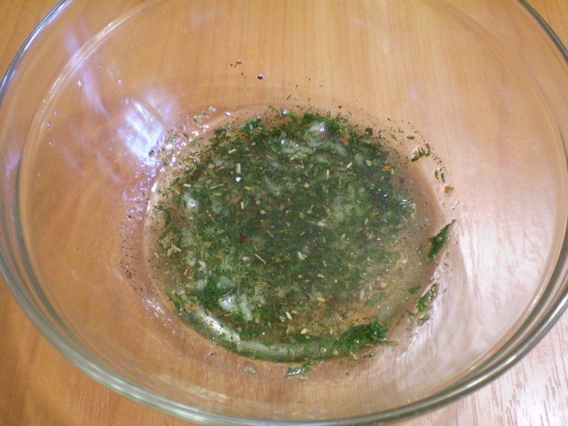 2. W tym czasie, przygotuj marynatę: Olej słonecznikowy wymieszaj z miodem, dodaj ocet, pieprz, posiekane świeże zioła i przeciśnięty przez praskę czosnek. Całość dobrze wymieszaj.