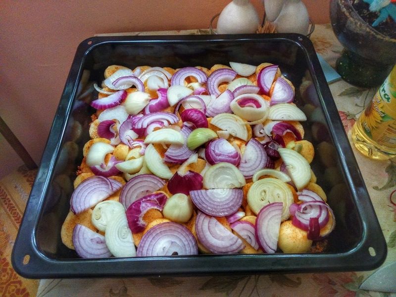 Kolejno cebulę pokroić należy w grube plastry i porozkładać na warstwie ziemniaków.