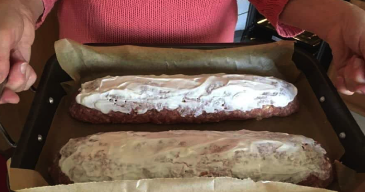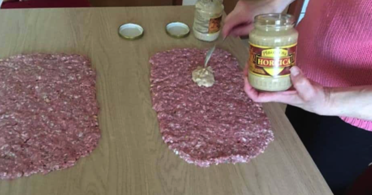 Następnego dnia podziel mięso na dwie części. Z mięsa uformować płaskie prostokątne placki i posmarować musztardą. Posypać tartym serem.