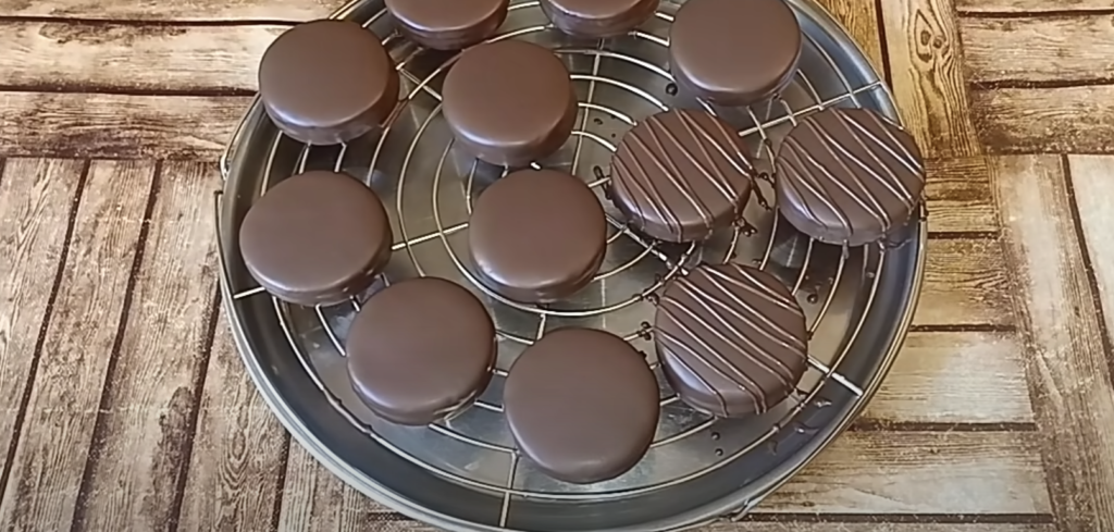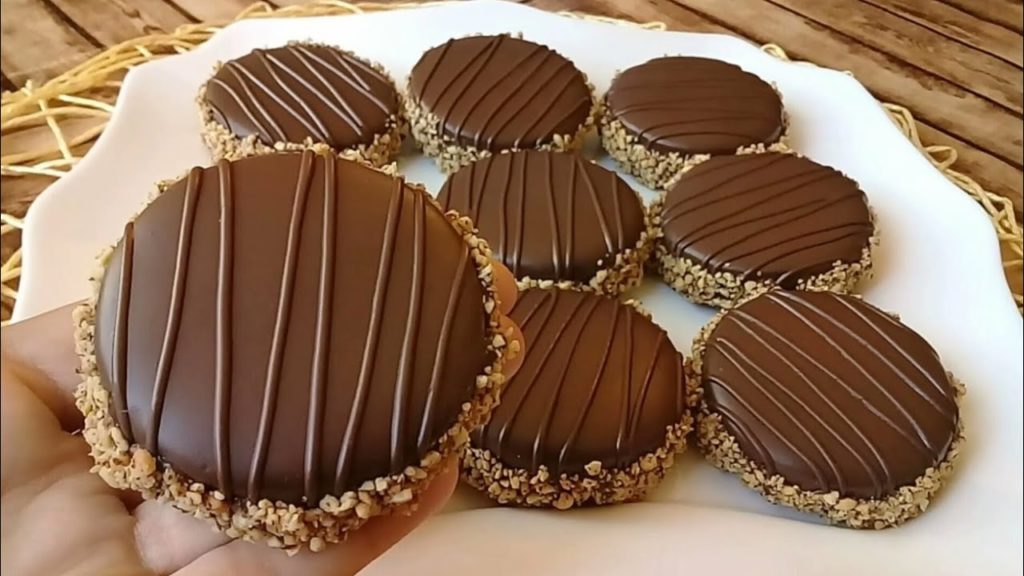 4. Ubij na gęstą masę i układaj na upieczonych kółkach. Zanurz w polewie, którą przygotujesz z roztopionej czekolady i odrobiny tłuszczu. Jako dekoracji użyj drobno posiekanych orzechów. Smacznego!