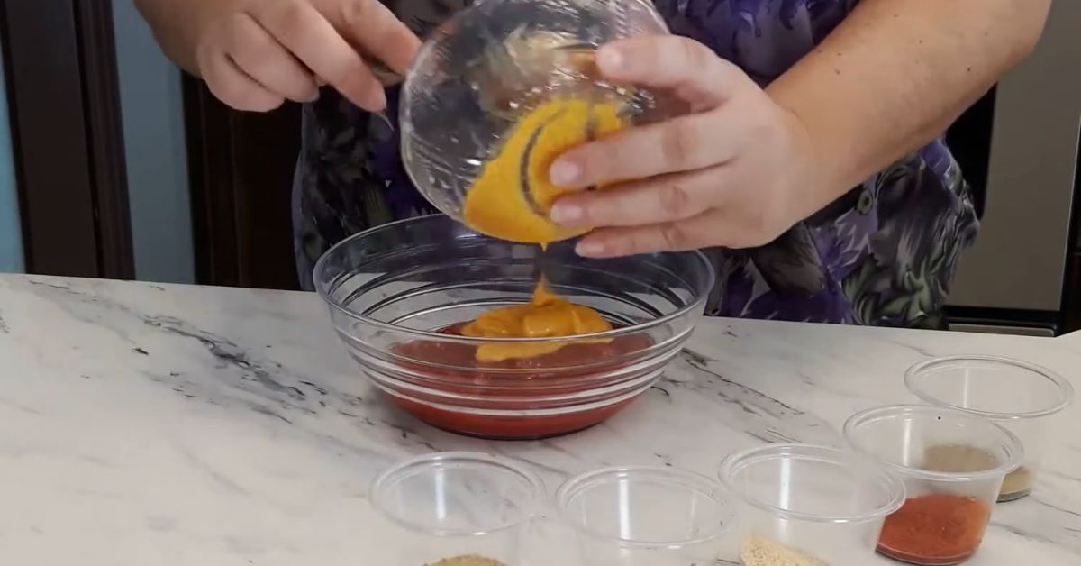 2.Do gorącej wody wrzuć kostkę bulionową, którą dokładnie rozpuść , po czym dodaj miód. Do tak przygotowanego bulionu koniecznie dodaj sos barbecue, ketchup oraz sok z wyciśniętej pomarańczy.