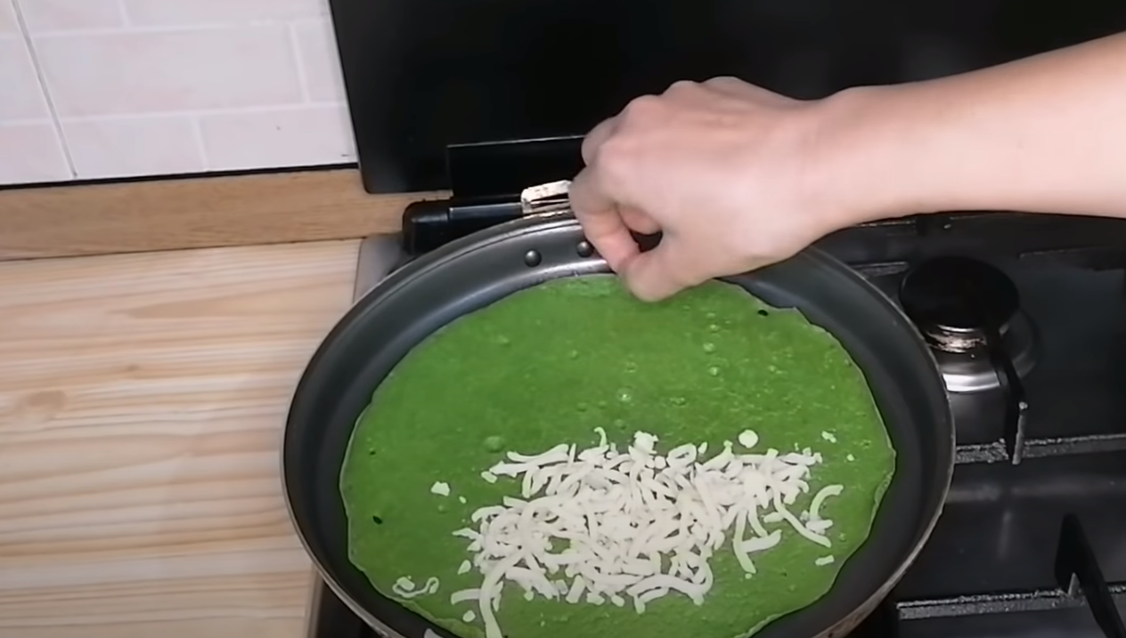 6. Na usmażony naleśnik połóż trochę startego sera , złóż go na pół, następnie smaż do momentu aż ser będzie ciągnący. To wszystko!