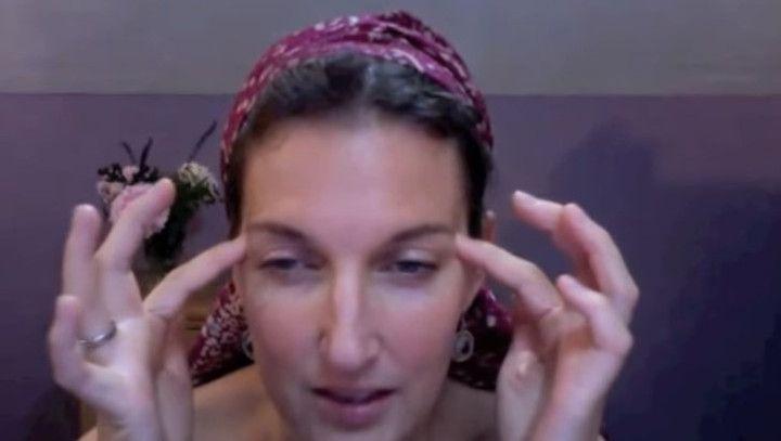 Ponownie przesuń punkty podparcia, tym razem na sam koniec brwi zacznij zataczać palcami niewielkie kręgi, masując łuki brwiowe spokojnymi ruchami.