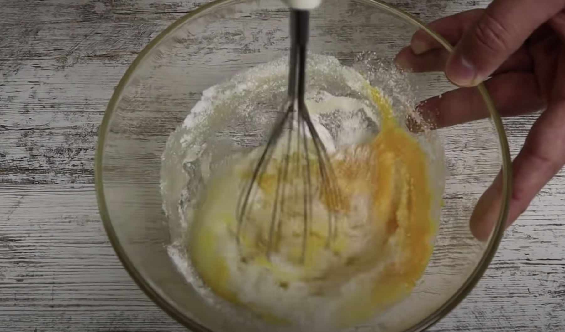 3. Powoli wsypuj mąkę z dodatkiem proszku do pieczenia. Za pomocą trzepaczki połącz ze sobą wszystkie składniki, aby powstała jednolita konsystencja.