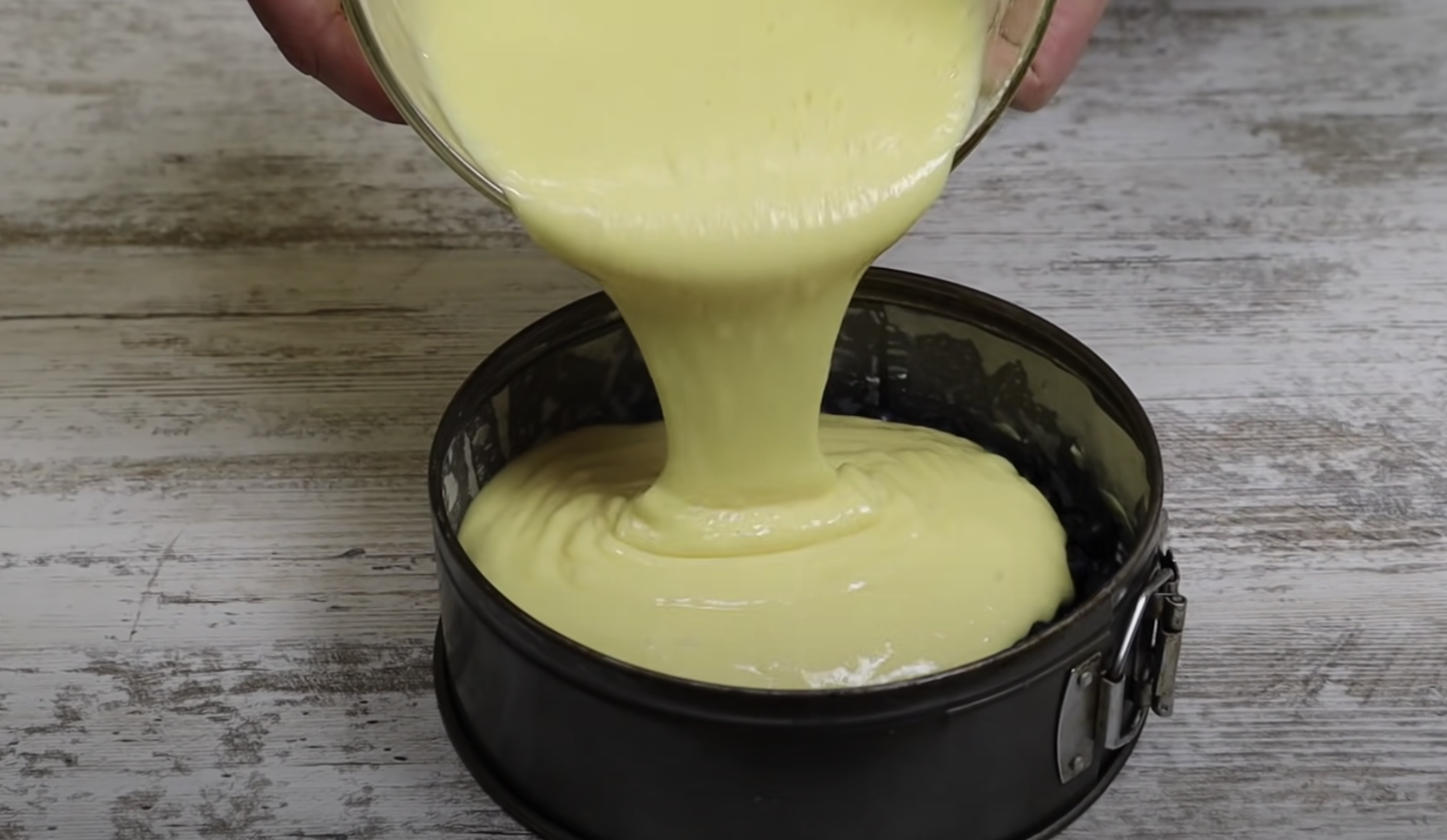 4. Wysmaruj dokładnie całą powierzchnię tortownicy. Na samym dnie ułóż owoce, następnie wlej na nie przygotowane ciasto. Całość dokładnie wyrównaj.