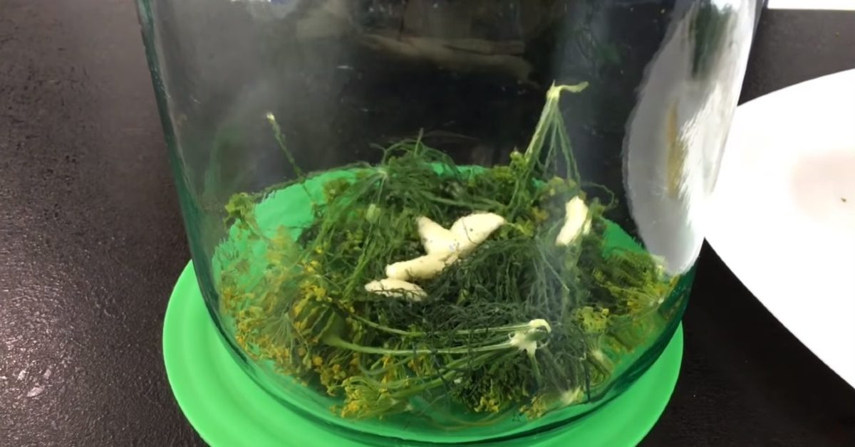 Teraz powkładaj ogórki do słoika, możliwie jak najbardziej ciasno, a następnie przykryj je pozostawionym koprem i posyp solą.