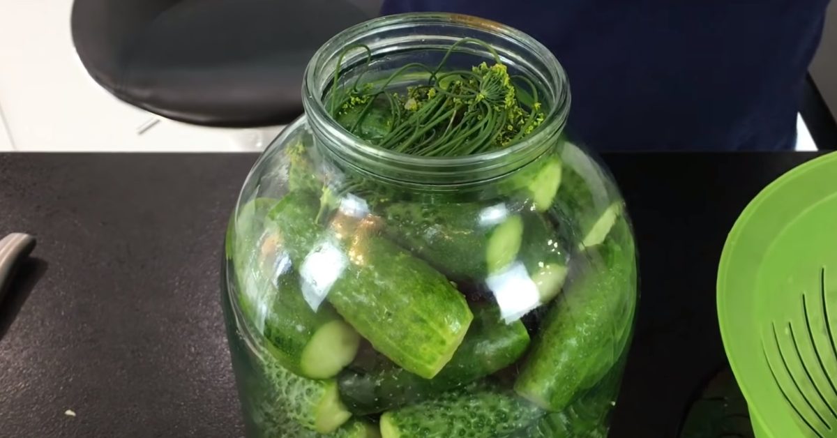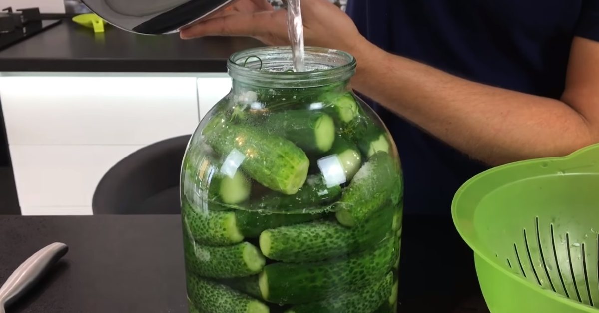 Teraz zalej ogórki zagotowaną wodą. Zakręć słoik pokrywką, delikatnie go  przekręć, aby rozprowadzić sól. Kiedy woda ostygnie, możesz wsadzić słoik do lodówki. Następnego dnia rano ogórki będą już gotowe i przepyszne. Podawaj jako dodatek do posiłku, albo jako samodzielną przekąskę.