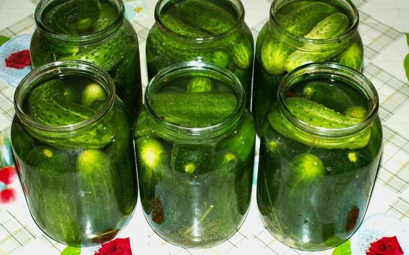3. Teraz przygotuj marynatę: Do garnka wlej wodę, dodaj cukier i sól. Zagotuj, a następnie wlej 150 ml octu. Dobrze wymieszaj i zalej marynatą ogórki w słoikach. Przykryj zakrętkami i pasteryzuj w garnku z wodą przez 5 minut.