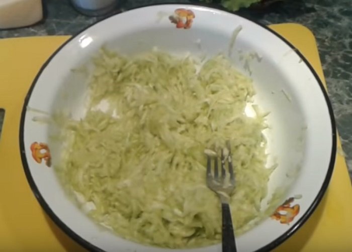 Wymieszać cebulę i surową cukinię z solą i pieprzem, a następnie dodać olej na dużą patelnię.