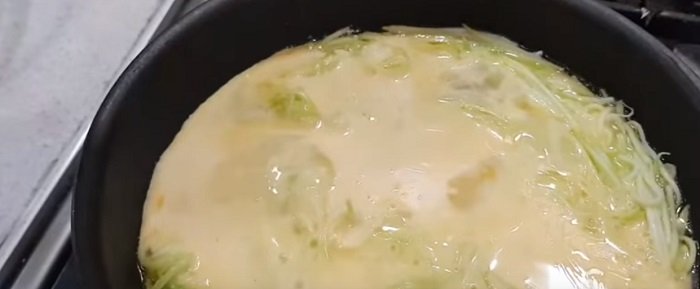 Smażyć cebulę przez 3-4 minuty z połową startej cukinii. W osobnej misce wymieszać jajka i połowę startej cukinii.
