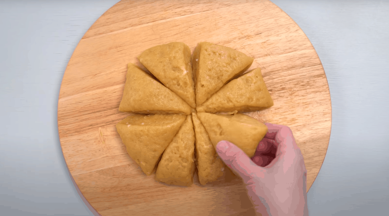 Następnie dodaj resztę mąki pszennej i zagnieć ciasto. Połóż je na desce i podziel na 8 równych części. Każdy z kawałków dokładnie rozwałkuj na płaski placek. Na suchej, rozgrzanej patelni umieść placki i smaż przez 1-2 minut na delikatnym ogniu z dwóch stron.