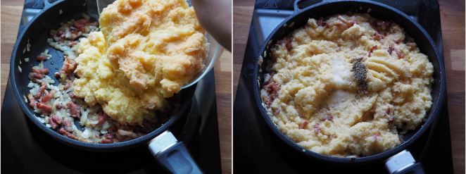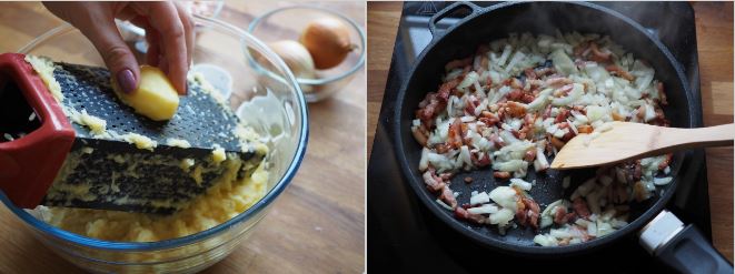 2. W kostkę pokrój obraną cebulę oraz boczek. Na początek podsmaż na rozgrzanej patelni boczek na złoty kolor, potem podsmaż cebulę. Dodaj później ziemniaki , smaż do momentu gdy zmiękną ziemniaki oraz całkowicie odparuje woda .Przygotowane nadzienie dopraw do smaku pieprzem oraz solą , następnie wymieszaj dokładnie całość i do wystygnięcia odstaw na bok.
