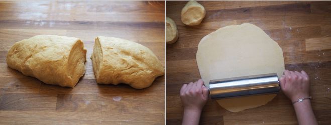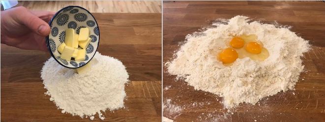 3. Czas na przygotowanie ciasta: Wsyp mąkę do miski, następnie dodaj żółtko, jajka, masło oraz sól. Dokładnie wymieszaj , następnie stopniowo dolewaj wody i zagniataj jednocześnie na jednolite, oraz gładkie ciasto. Folią spożywczą owiń przygotowane ciasto, następnie na 15 minut odstaw na bok.