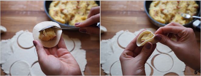 4.Po upływie tego czasu, rozwałkuj ciasto, gdy klei się za bardzo do blatu to mąką je lekko posyp. Za pomocą szklanki wycinaj z ciasta kółka. Na wyciętym kółku nałóż farsz i sklejaj tak jak tradycyjny pierogi.