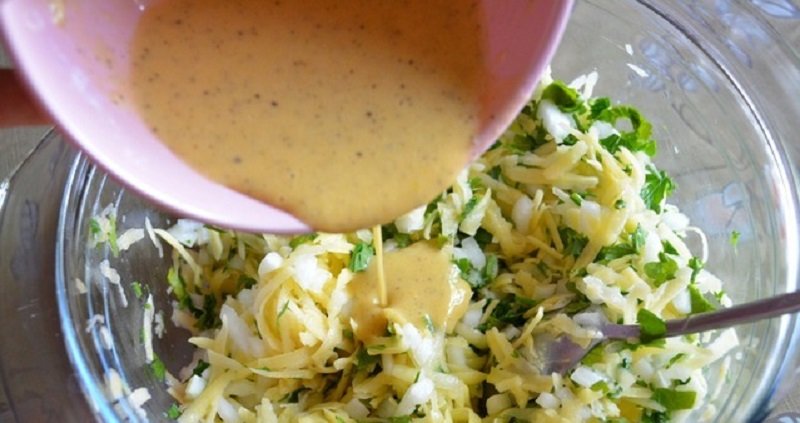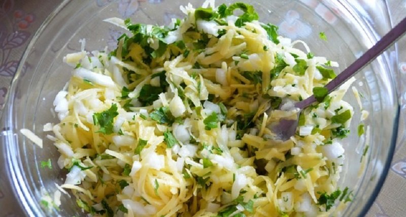 2. Obraną cebulę, zmiel blenderem, natkę pietruszki posiekaj. Dodaj do startych ziemniaków i wymieszaj.