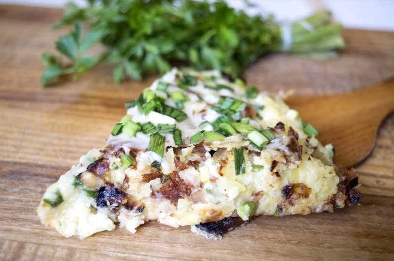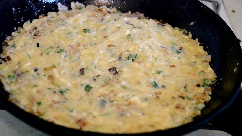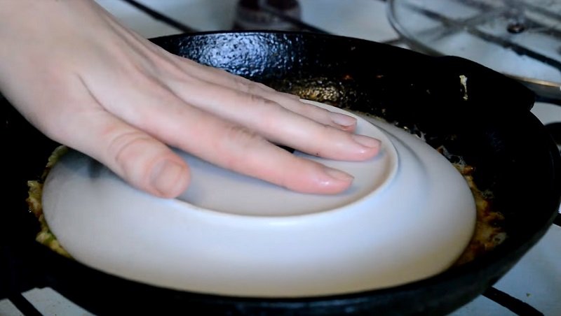 6. Z pomocą łopatki lub talerzyka, przewróć placka na drugą stronę i smaż przez kolejne 15 minut pod przykryciem na złoty kolor.