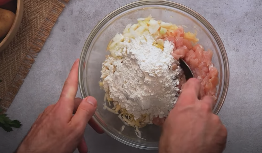 1. Na tarce o grubych oczkach zetrzyj ziemniaki. Włóż do miski, następnie pokrój i dorzuć do ziemniaków piersi z kurczaka. Cebule drobno pokrój , dodaj do miski i pozostałe składniki czyli sól. Pieprz, jajka i mąkę. Wszystkie składniki połącz ze sobą.