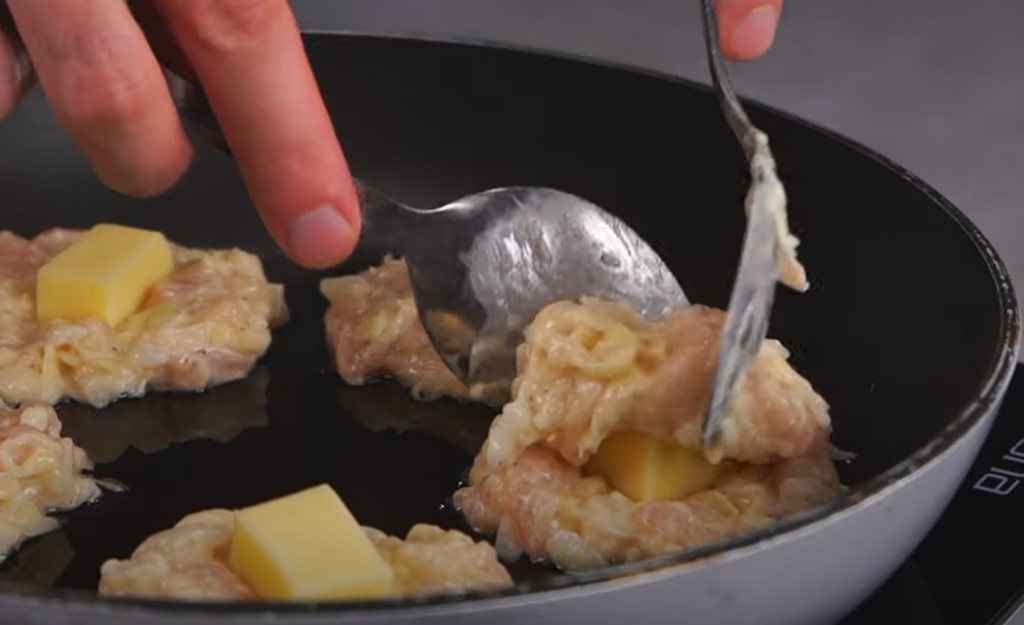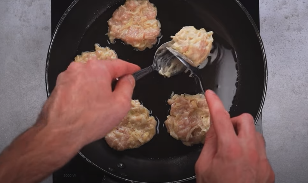 2. Na patelnię wlej olej i układaj małe placuszki za pomocą łyżki. Uformuj placuszki i smaż po obydwu stronach na złocisty kolor.