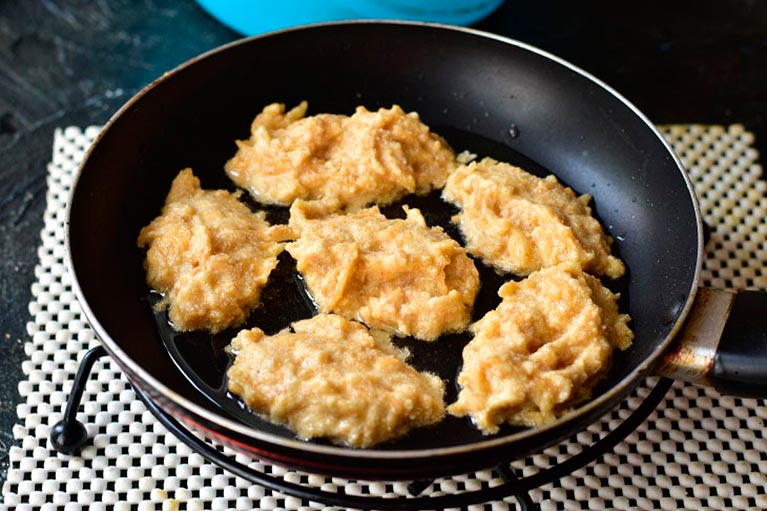 4.Przygotowaną masę kładź na gorący olej i smaż placuszki na złoty kolor z dwóch stron na małym ogniu. To cały przepis!