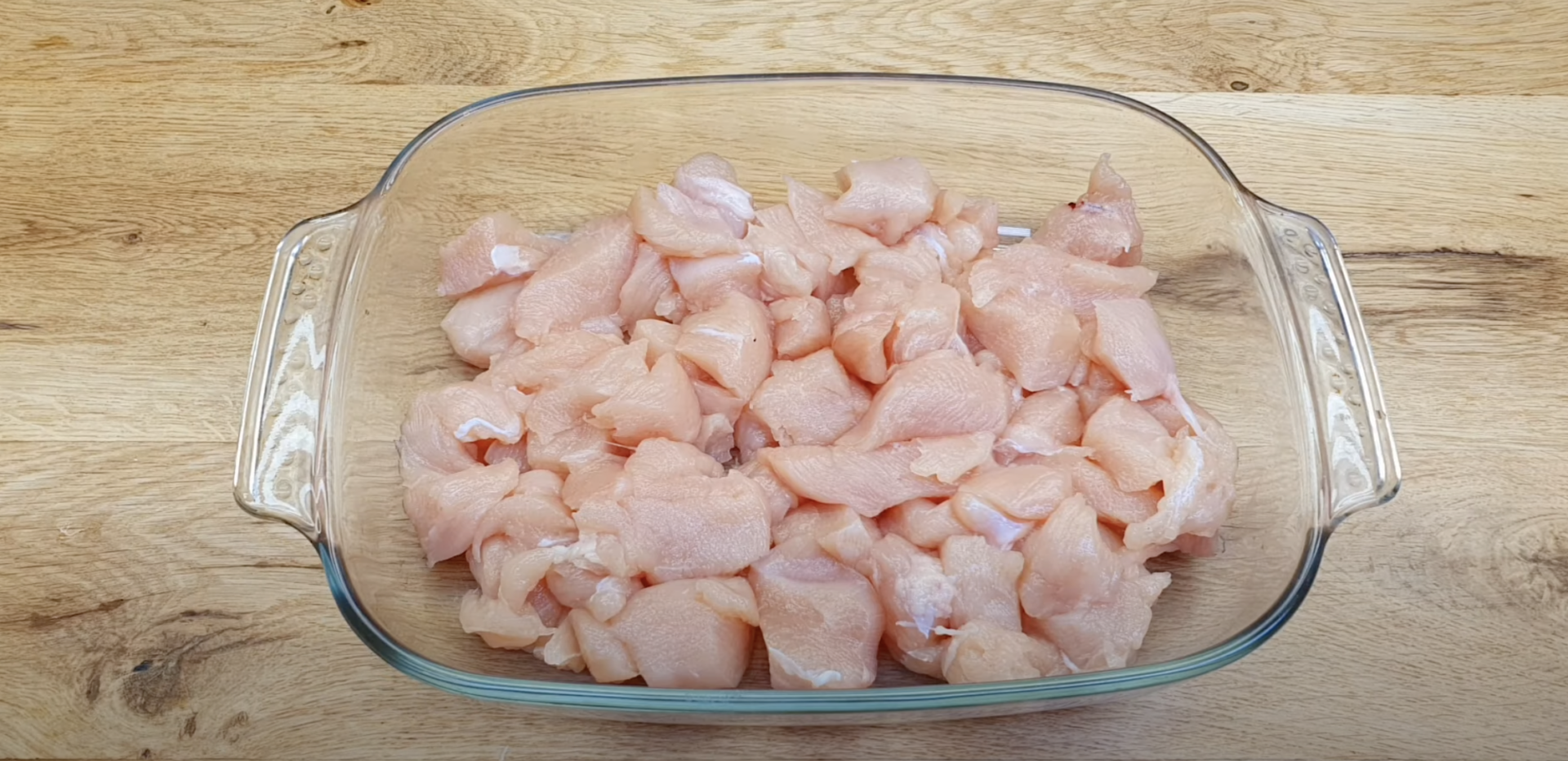 1.W kostkę pokrój dokładnie umyte filety z kurczaka.