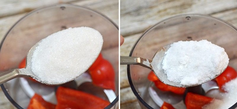 2.Obrane oraz umyte marchewki zmiel z papryką oraz obranym czosnkiem w blenderze lub użyj do tego maszynki do mięsa. Następnie wsyp cukier oraz sól.