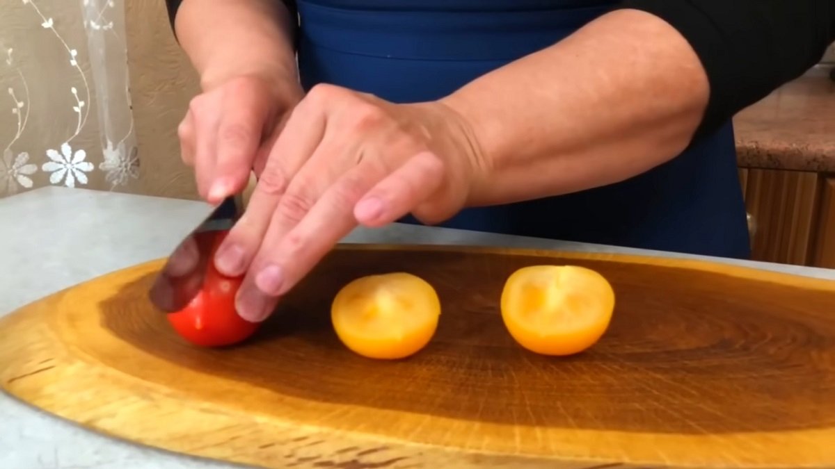 1.Na samym początku przekrój na pół wszystkie umyte pomidory, po czym na plasterki pokrój czosnek, a natkę pietruszki drobno posiekaj.