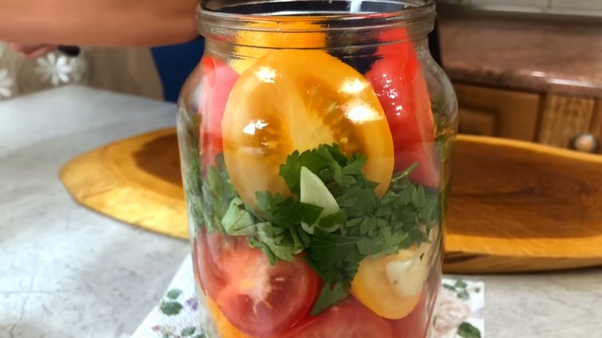 2.Do czystych słoików powykładaj pokrojone pomidory , następnie wrzuć do nich kilka ziarenek pieprzu, parę plasterków czosnku oraz odrobine posiekanej natki pietruszki. Następnie ponownie włóż pomidory, po czym całość zalej gorąca wodą ( powinno tak wyglądać jak na zdjęciu poniżej). Na kwadrans odstaw słoiki, które wcześniej zakręciłaś.
