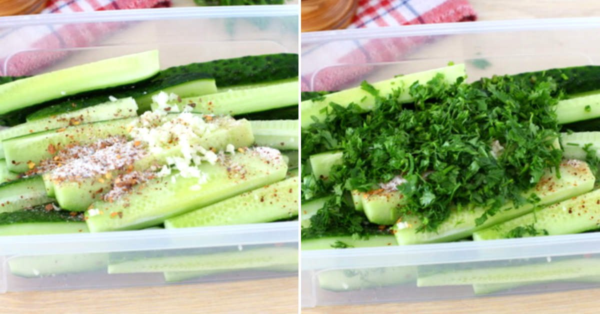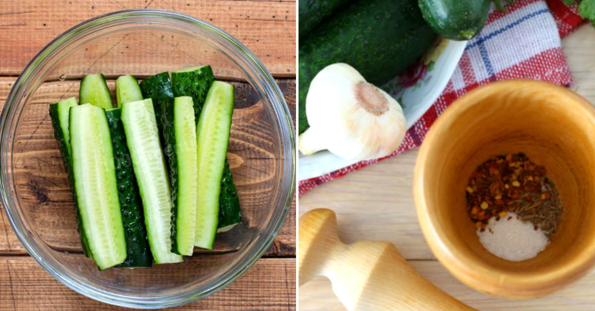1. Potrzebny będzie pojemnik z pokrywką. W grube plastry pokrój wszystkie umyte ogórki, następnie włóż je do przygotowanego pojemnika. W moździerzu połącz ze sobą kminek, cukier oraz paprykę ostrą.